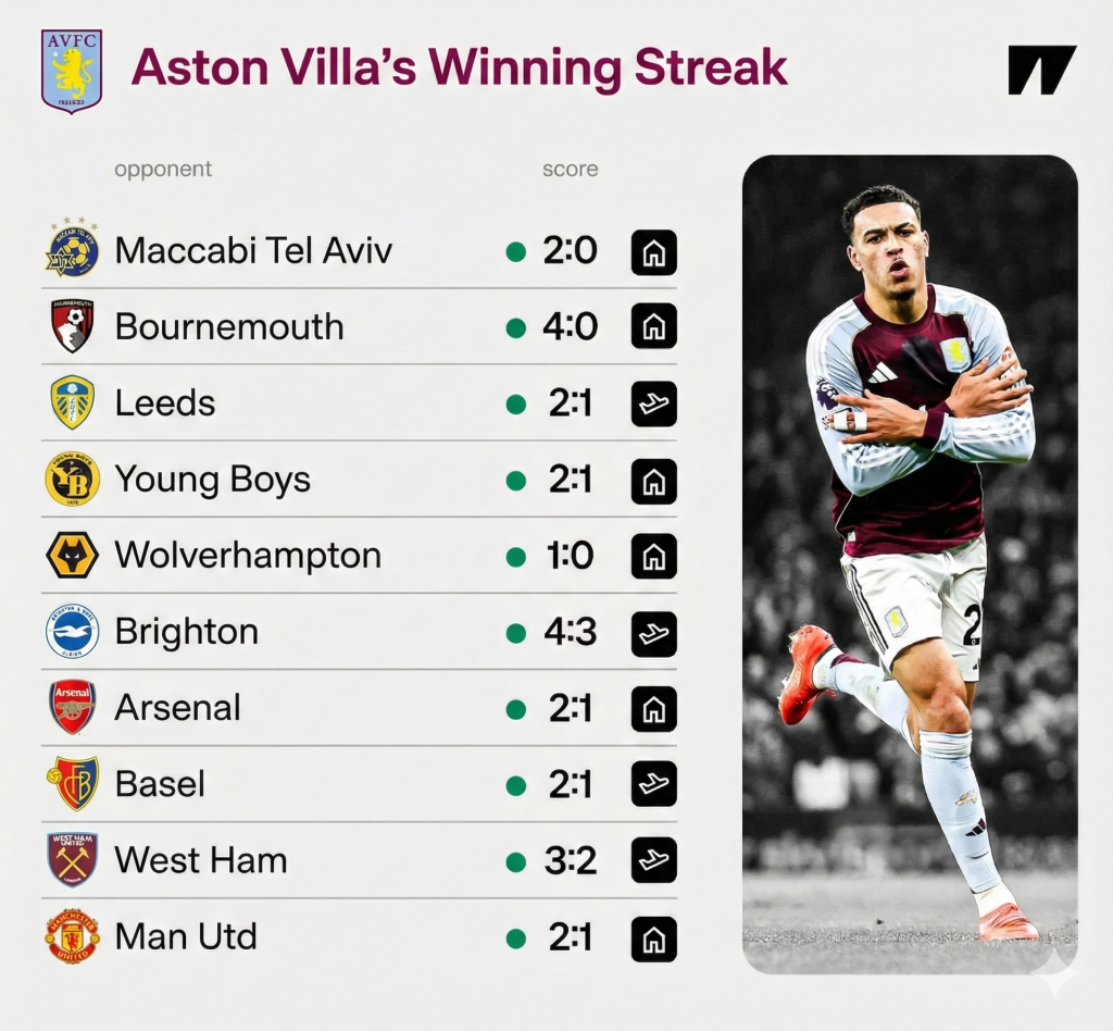 Di bawah kepemimpinan Unai Emery, Aston Villa bertransformasi dari tim yang kesulitan di awal musim menjadi salah satu tim paling konsisten di Eropa. Rangkaian hasil positif ini membuat mereka hanya terpaut tiga poin dari pemuncak klasemen Arsenal, sekaligus memastikan tiket ke fase gugur Liga Europa.